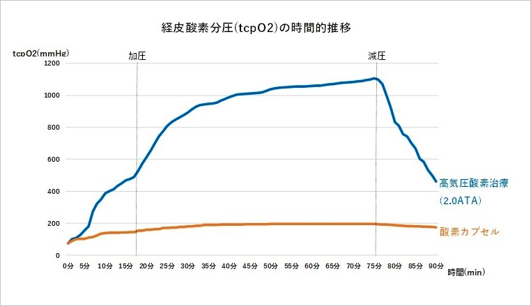 近年、疲労回復やケガからの早期回復目的で酸素カプセルを利用する人がいますが、当院での高気圧酸素治療は酸素カプセルとは異なります。酸素カプセルでは21%の酸素で1.3気圧程度までしか加圧できませんが高気圧酸素治療の場合、100%の酸素で2.0気圧まで加圧することが可能です。そのため、身体の中に溶け込む酸素の量(溶解型酸素)が増加し様々な病気の回復が期待できます。下記は高気圧酸素治療と酸素カプセルにおける血液中の酸素量を皮膚上で測定した経皮酸素分圧(tcpO2)の比較です。