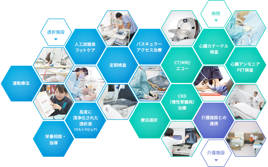 偕行会グループは、高い専門性で合併症の予防から治療まで総合的にサポートしています。透析患者様は全身の動脈硬化や免疫力の低下など、病気になるリスクが高いと言われています。合併症を予防、早期発見・治療するため、グループ内で透析施設・病院・介護施設が連携し、きめ細やかな対応を行っています。