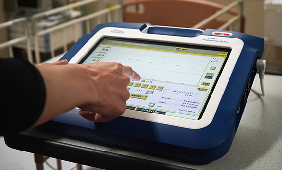 心臓植込み型デバイス(PM・ICD・CRT・ICM) の設定や、動作テストを行うプログラマーの操作(植込み手術及び定期チェック)、測定データの管理を行っています。また、遠隔モニタリングを用いて自宅にいる患者様の日々のデータを確認し、不整脈イベントやデバイスの異常等を早期発見できるよう努めています。