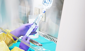 外来化学療法センターにて、抗がん剤の混注、患者様指導